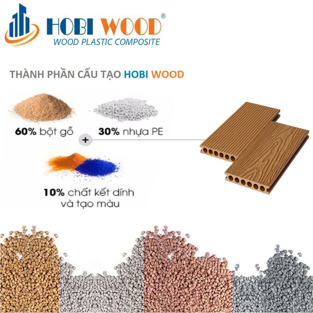 - Gỗ nhựa thì đều có cấu tạo chung là WPC (Wood Plastic Composite): là hỗn hợp của bột gỗ, nhựa HDPE và các chất phụ gia.